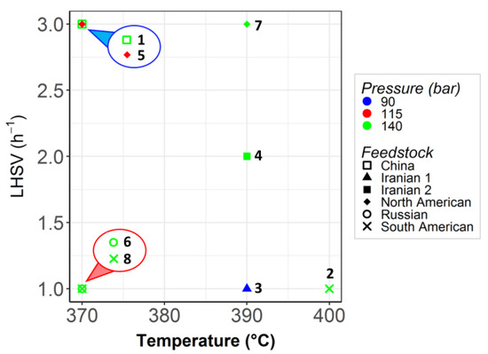 Operating conditions of eight selected episodes (liquid hourly space velocity (LHSV) vs. temperature).