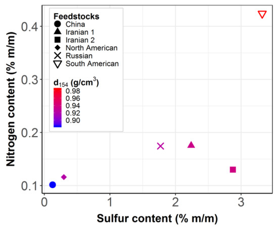 Sulfur, nitrogen content, and specific gravity at 15 °C for the feedstocks in the database.