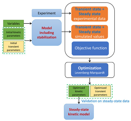 Figure 12 shows the parameter estimation algorithm for the model including stabilization. The model simulates the output variable by using the transient and kinetic parameters as well as the input variables. The calculated response value was compared with the experimentally observed one via an objective function, which is the sum of weighted squared relative errors. A Levenberg–Marquardt algorithm [29,30] was used to determine the minimum of this objective function. As the problem is nonlinear, the optimization may yield a local minimum (i.e., it does not guarantee the identification of the global minimum). Therefore, we needed to repeat the optimization a number of times using randomly selected initial parameters. Only the optimal parameters corresponding to a minimum value of objective function were retained. The optimal kinetic parameters were then validated by using a validation database at the steady-state condition. Whether stabilization was accounted for or not, the parameter estimation procedure was identical, except that the transient parameters are irrelevant when considering the steady-state data only. Hence, the data at steady-state condition can be employed to calibrate the steady-state model while the transient as well as steady-state data can be included in the calibration database to tune the model including stabilization. The technique to obtain the calibration and validation database is described in Section 3.3.3.