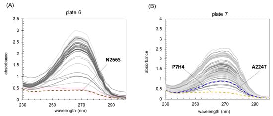 The UV absorbance spectrum of OxdYH3-3 mutants. OxdYH3-3 mutant clones were inoculated in 96 deep well plates, and fully-grown cells were transferred to new 96 well plates to screen OxdYH3-3 mutants that showed an improving activity to 2-furfuryl aldoxime. 10 mM furfuryl aldoxime was added in the plate, and, after a specific time, the reaction mixture was isolated and diluted. The UV absorbance between 230 and 300 nm was measured. Among 10 microplates, N266S was found in plate 6 (A), P7H4 and A224T were found in plate 7 (B).