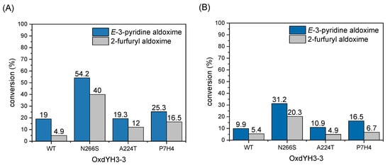 In terms of conversions, 19% and 5% were found for the wild-type of the aldoxime dehydratase, OxdYH3-3 WT, when starting from a substrate concentration of 50 mM of E-3-pyridine aldoxime and 2-furfuryl aldoxime, respectively (Figure 3).