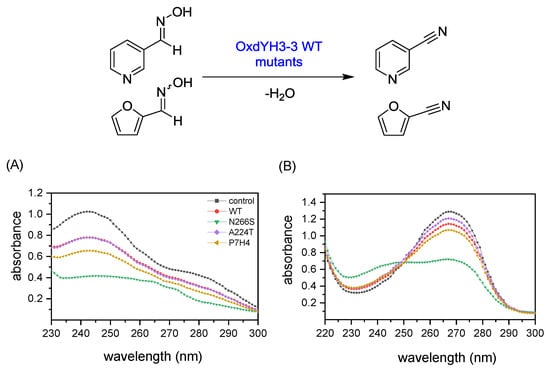 Absorbance scans of reaction solutions after 1 h of reaction time for reactions being performed at a substrate concentration of 50 mM of E-3-pyridine aldoxime (A) and 2-furfuryl aldoxime (B). Experiments with solutions of the substrates without biocatalysts were carried out as control experiments.