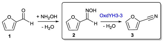 In continuation of our research on the biocatalytic synthesis of nitriles under cyanide-free conditions as an alternative synthetic technology for nitriles [,,,,,,,,,,,,], we could also demonstrate a proof of concept for the two-step conversion of furfural into 2-furonitrile (Scheme 1) [,]. In detail, furfural (1) is transformed into its aldoxime (2) by spontaneous condensation with hydroxylamine, which is a bulk chemical that is utilized in α-caprolactam manufacturing. Subsequently, the aldoxime is enzymatically dehydrated in an aqueous medium to furnish the desired 2-furonitrile (3).