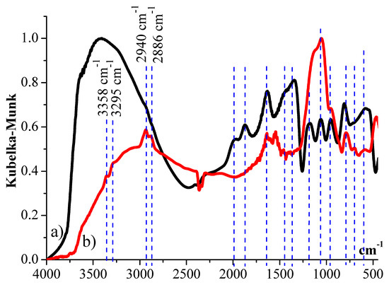 Silica modification with aminopropyl groups with an NH2 content of 30 wt.% was verified by Fourier transform infrared spectroscopy (Figure 2). The analysis of the FTIR spectra of modified and pure supports revealed the broad bands centered around 3441 cm−1 and correspond to O-H groups’ vibrations. On the other hand, the spectrum of amino-functionalized silic peaks at 2940 and 2886 cm−1 and is assigned to the C-H stretching vibrations of CH- and -CH2- groups, which can be attributed to the incorporation of the amino group [22,43]. The peak of the C–N stretching vibration at 1140 cm−1 overlaps with the Si-O-Si stretching band in the range 1000–1200 cm−1. The peak of the N–H stretching vibration at ~ 3295 and 3358 cm−1 overlaps with a wide peak of stretching vibration at O–H at 3080 cm−1 [22,43]. The intense bands appearing at 1059 and 1176 cm−1 were assigned to the asymmetric stretching vibrations Si-O-Si. The symmetric stretching vibrations of Si-O-Si, deformation vibrations of O-Si-O and C-Si-O, and in-plane stretching vibrations Si-O can overlap in the 582, 814 and 953 cm−1 range. The bands of Si-O stretching vibrations give reason to suggest the existence of SiO2 network defects. The band observed at 467 cm−1 is assigned to the plane-stretching vibrations of Si-C [43].