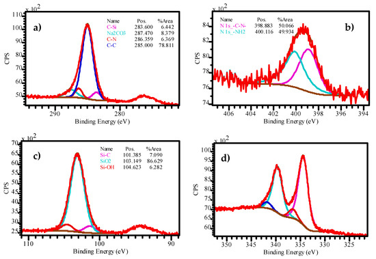 The presence of quantities of aliphatic carbon compounds in silica is a result of the inclusion of an aminopropyl substituent in the silica structure, and the incomplete hydrolysis of silane and carbon pollution. The C-N and C-Si bonds prove the inclusion of aminopropyl substituents in the silicon oxide matrix. According to the published data [43,44], the peaks at 399.5 and 401.6 eV in the spectrum of N 1s can be attributed to C-N and N-H bonds that correlate with the IR-spectroscopy data (Figure 2) [43,44]. The bonds -C-ONa belong to molecules of sodium carbonate (Figure 3) [43,44].