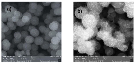 SEM images of (a) SiO2-C3H6-(30%)NH2 and (b) 5 wt.% Pd/SiO2-C3H6-(30%)NH2.