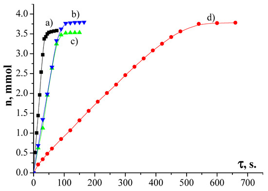 Kinetic curves of hydrogen uptake in the 4-nitroaniline hydrogenation in aqueous 2-propanol (0.68 mol fraction). T = 298K, m(cat) = 0.30 ± 0.05 g., m(NA) = 0.50 ± 0.05 g. (a) 5 wt.% Pd/SiO2-C3H6-(30%)NH2; (b) 5 wt.% Pd/C; (c) 5 wt.% Pd/γ-Al2O3; (d) 5 wt.% Pd/SiO2.