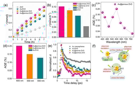 (a,b) Photocatalytic hydrogen generation rates of ZnO and the structure-adjustable Au-ZnO hybrids. (c) Apparent quantum efficiency (AQE) of the Au@porous ZnO hybrids. (d) AQEs of the structure-adjustable Au-ZnO hybrids tested at their plasmon resonances. (e) Normalized time-resolved optical differential transmission for Au and the structure-adjustable Au-ZnO hybrids. (f) Schematic illustrating the possible hot electron injection processes in the structure-adjustable Au-ZnO hybrids.