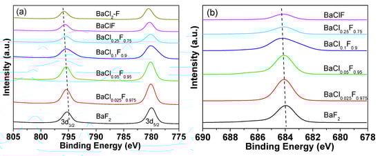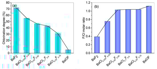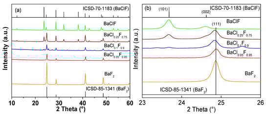 As disclosed in Figure 2a, BaF2 has a sharp diffraction peak indicating the complete crystallinity. Following the doping of small amounts of Cl, the crystallinity of BaF2 is weakened significantly. Clearly, during preparation, in addition to the Cl source, the introduction of NH4Cl also functions as a template during the formation of BaF2 particles. Actually, during the process of low-temperature solid-state synthesis, both the particle size and morphology of solid products can be controlled in the presence of proper templates [,,]. A very weak diffraction of BaClF is observed for BaCl0.1F0.9. With the further increase in Cl content, the XRD pattern gradually changes from BaF2 to BaClF, which indicates that the crystal phase of the BaClF is formed continuously after adding Cl, which is more obvious when the Cl content is higher than the BaCl0.25F0.75, because half of the BaF2 is transformed into BaClF. In addition to the transformation of the phase structure, the 2θ of BaF2 shifts following the addition of Cl (Figure 2b). Clearly, the presence of small amounts Cl during solid-state preparation disturbs the formation of BaF2 crystalline significantly [,].
