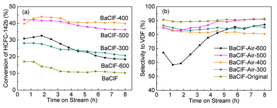 Following XRD experiments, the calcined BaClF catalysts were further evaluated for the catalytic pyrolysis of HCFC-142b. The results are displayed in Figure 7. After calcination, the conversion levels of HCFC-142b over BaClF are significantly improved (Figure 7a). Generally, the conversion agrees with the crystal sizes obtained by XRD patterns. BaClF calcined at 400 °C exhibits a relatively high conversion with a small crystal size. Further increases in calcination temperature lead to the sintering of BaClF. Correspondingly, the conversion drops with temperature. As small crystalline particles were obtained following calcination, stable selectivity to VDF is also achieved (Figure 7b).