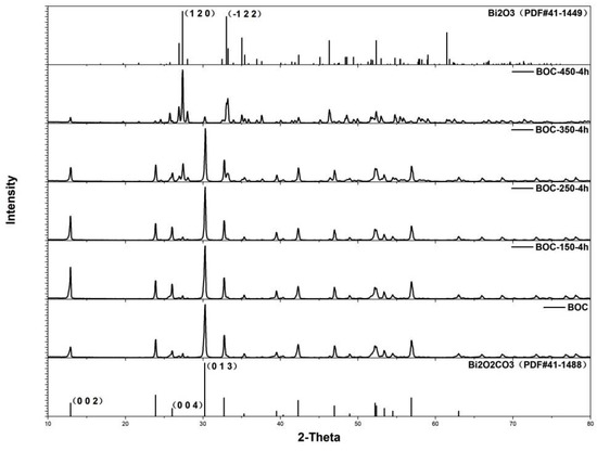 As shown in Figure 1, the sample fabricated by hydrothermal method was indexed as tetragonal Bi2O2CO3 without impurity. Temperature had significant influence on the phase transformation during anneal in nitrogen. When BOC annealed at 150 °C for 4 h (BOC-150-4 h), the diffracted intensity of (002) peak was stronger than primitive BOC. The diffracted intensity ratios of (002)/(013) and (004)/(013) were 0.25 and 0.15 for primitive BOC. The ratios were 0.60 and 0.28 for BOC-150-4 h, much larger than that for primitive BOC. That indicated tetragonal Bi2O2CO3 went crystal facets evolution during annealing under 150 °C for 4 h. (002) facet was superior at high temperature [33,34,35,36]. Nevertheless, higher temperature led to phase transition from BOC to Bi2O3, as revealed by XRD results. The sample of BOC-350-4 h had diffracted peaks located at 27.38°, which could be indexed as the (012) facet of Bi2O3. BOC-450-4 h could be indexed to α-Bi2O3, according to XRD patterns. BOC was reported to be unstable at high temperature. When heated at 350 °C, BOC decomposed and transformed to Bi2O3 and CO2 [37]. A moderate temperature was proposed for BOC annealing. The sample ofBOC-250-4 h showed no phase transition, however, the diffracted peaks ratio of (002)/(013) and (004)/(013) were 0.46 and 0.25, those were smaller than that of BOC-150-4 h.