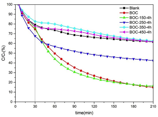On the basis of Formula (1), k values for various samples were calculated. The specific numbers for BOC-150-4 h, BOC-150-8 h, BOC-150-12 h, BOC-150-24 h, BOC-150-48 h were 0.0105, 0.0211, 0.0161, 0.0168 and 0.0116 min−1, respectively. BOC-150-8 h had the largest k value, with higher ratio of (002) and (004) crystal face exposed from Figure 3, which may have contributed to the separate of photo-excited hole-electron pairs that led to the photodegradation rate constant of BOC-150-8 h being larger than any others. At the same time, BOC-150-48 h had a lower reaction rate than samples heated for 4 h, 8 h, 12 h or 24 h, which suggests longer annealing times may not always result in better performance.