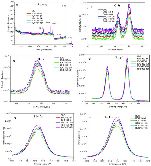 Spectra of BOC samples: survey scan (a), C1s (b), O1s (c) and Bi4f (d–f).