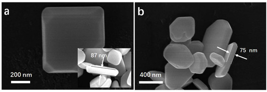 SEM images were obtained to investigate the morphology of the samples, which are presented in Figure 5. According to the SEM images, samples prepared by hydrothermal method showed irregular polyhedral structures with lateral length of 300~900 nm (Figure 5a). After annealing at 150 °C for various times, the appearance of BOC showed negligible changes compared to the primary sample (Figure 5b, Figure S3). The typical thickness of the annealed sample was few tens of nanometers. It appeared to be two-dimensional nanosheets [42]. It implied that a low temperature annealing process had no apparent effects on the morphologies. This was further supported by BET measurement.