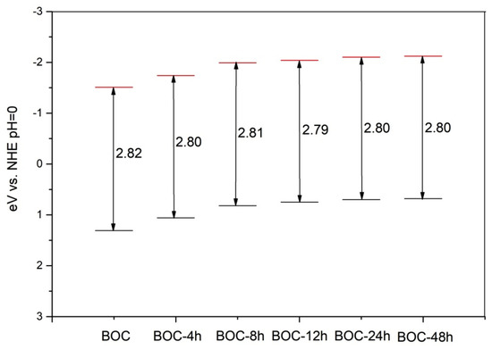 where EVB and ECB are the semiconductor VB and CB potentials, respectively, X is the absolute electronegativity of the semiconductor, Ee is the energy of free electrons on the hydrogen scale (~4.5 eV), Eg is the semiconductor band gap. Whereas the absolute electronegativity is the energy difference between the vacuum level and the mid-gap position of semiconductor, the work function value is the difference between the vacuum level and the Fermi energies, which of pure Bi2O2CO3 is zero [26]. According to the above formulae, the EVB and ECB of the samples were calculated, and the band gap structures were obtained (Figure 7). It can be concluded that valence band edge position and conduction band edge position become more negative when we prolonged the annealing time in nitrogen.