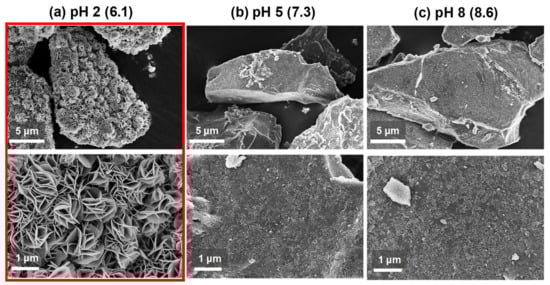 Figure 1 presents SEM images of the samples obtained after the hydrothermal reactions of the precursor mixture solution of Ni(NO3)2 and Al(NO3)2 with urea at different initial pH conditions (2, 5, and 8), with SiC particles suspended in the solution. The initial and final pH of the solution are shown in Figure 1. Since the urea was co-added in the precursor solution, the pH of the solution during the hydrothermal reaction rose steadily due to decomposition of the urea []. The sample prepared at a low initial pH condition (Figure 1a, pH = 2.0) clearly shows the formation of a NiAl-LDH shell with a petal-like surface morphology consisting of densely distributed platelets grown on the SiC particles. The coverage of the LDH crystallites on the surface of SiC particles was uniform. The LDH platelets were developed with a unidirectional spatial orientation of their ab dimension, perpendicular to the SiC particle surface. The typical platelet morphology of LDH crystallites is known to have ab-faces of the platelets that are much larger than the dimension along the c-axis (thickness) of the platelets []. The thickness of the platelets was in the range 10–70 nm, while the width was in the range 500 nm–1.2 μm. Notably, the heterogeneous formation of NiAl-LDH on the surface of SiC particles could only be achieved when the initial pH of the precursor solution was very low. Figure 1b, and 1c shows the resulting samples obtained after the hydrothermal reaction under similar synthesis conditions but using different initial pH of the solutions of 5 (Figure 1b) and 8 (Figure 1c), respectively. Clearly, these samples only exhibit the SiC particles without any indication of the developed LDHs having been attached on the surface. In these conditions, LDH particles were homogeneously formed in the solution, without having a preferential growth on the SiC particles. The results suggest the critical importance of the initial pH of the synthesis solution for the heterogeneous growth of NiAl-LDH crystallites on SiC surfaces, as will be discussed shortly.