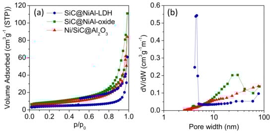 (a) N2 adsorption-desorption isotherm and (b) Barrett-Joyner-Halenda (BJH) pore size distribution of SiC@NiAl-LDH, SiC@NiAl-oxide, and Ni/SiC@Al2O3 catalyst.