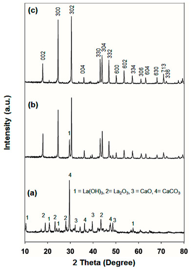 The X-ray diffraction patterns of synthesized samples (a) LC-1, (b) LC-2, and (c) LC-3 was shown in Figure 1. Figure 1a reveals that LC-3 was composed of a mixture of Ca(OH)2, CaCO3, and La(OH)3, indicating that phase-pure hexagonal LaCO3OH could not be formed at a La:Ca molar ratio of 25:75 mol%.