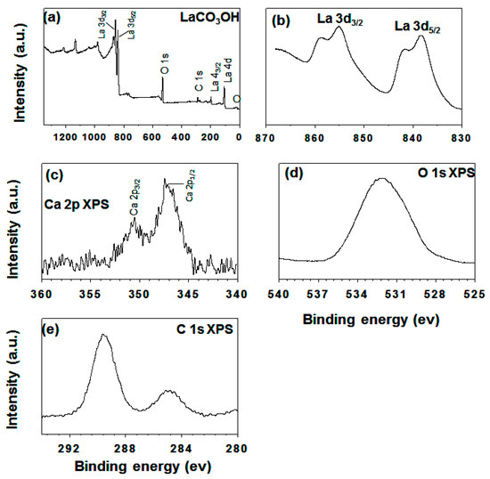 These outcomes match well with the EDS results. As presented in Figure 6b the main peak occurred at 838.8 and 855.3 eV, which corresponds to the 3d0, 4f1 configuration of La 3d5/2 and La 3d3/2 with shake-up peaks (the 3d04f1 configuration). These peaks presented the oxidation state of La(III). For the sample of LC-3, two broad peaks were seen at 351 and 347 eV in the region of Ca 2p, showing the presence of Ca in the compound of LaCO3OH. This investigation, hence, uncovered another synthetic method dependent on modulating La and Ca molar proportion for the LaCO3OH nanoprism structure fabrication in its pure phase. In the previously prepared sample, O 1s XPS peak of broad nature corresponds to oxygen lattice was appeared at 531.5 eV [40]. As presented in Figure 6e, the C 1s spectrum having two peaks at 284.60 eV and 289.6 eV were designated to carbon and carbonate contamination, respectively. While at 289.60 eV, C 1s electron binding energy was given to the C–O peak. The percentage of atomic ratio calculated using the XPS experiment (Table 1) is very important. It plays crucial role in deciding the real catalytic reaction mechanism.