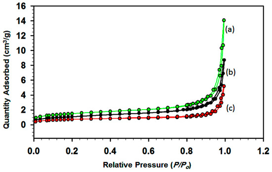 Figure 7 shows the pore structures of LC samples with molar ratios of: (a) 25:75, (b) 50:50, and (c) 75:25, which were obtained by determining their N2 adsorption–desorption isotherms. The pores range from large mesopores to macropores because there is a marked leap in the high P/P0 range (0.8–1.0) in the isotherms of all samples. The presence of slit-like pores is suggested by the type of isotherm, which is characteristic of adsorption on a layered solid. The surface areas were found to be 5.15, 2.45, and 3.75 m2/g for the samples in Figure 7a–c, respectively, which indicates that the surface area is high when the La content is low. The nanoparticles with a spherical structure have higher surface areas. The surface area plays a crucial role in catalytic process, as defined in the section below.