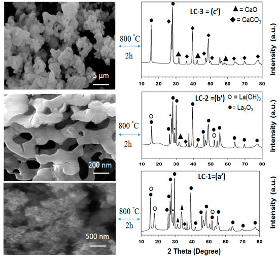 The demand for methane as a de-NOx catalyst for high-temperature applications is increasing considerably due to easy availability and low cost. It is important to note that methane activations happen at a higher temperature. Thus, X-ray diffraction, FESEM image analysis, and NO reduction testing were performed over all as-synthesized samples after heat treatment (800 °C for 2 h). Figure 9a′–c′, displays the X-ray diffraction patterns of calcined (800 °C for 2 h) samples of LC-1, LC-2, and LC-3. The results obtained for LC-1, LC-2, and LC-3 were shown in Figure 9a′–c′ respectively, had peaks due to CaO and La2O3 for the three samples. For La(OH)3, three peaks were observed in sample in Figure 9 (LC-1-(a′)).