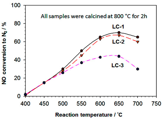 NO reduction activity was started at 400 °C and increased gradually with maximum activity ranges between 600–660 °C. For LC-1 sample highest NO conversation activity was recorded, which was 70% in the 600–670 °C temperature range. Further increment in temperature, i.e., beyond 660 °C, caused decreases in NO conversion activity for all samples. The LC-1 sample showed the highest NO reduction activity probably due to its higher oxidation rate by oxygen other than these catalysts, which is a hydrocarbon-consuming side-reaction. The catalytic performances of LC-1 and LC-2 catalysts were found to be more superior as compared to LC-3, catalysts are most likely due to the presence of CaO containing the La2O3 phases in both catalysts. The high catalytic activity of the LC-1 sample was observed due to the high surface area, presence of La and Ca mixed active phases, presence of high La and Ca atomic ratio, and cotton-like morphology, which might help absorption and decomposition. Anastasiadou et al. reported that La2O3–Ca2+ mixed oxides system enhanced the NO reduction with CH4 compared to pure La2O3 and CaO alone in the presence of O2. Table 1 shows the presence of La2O3 and CaO in the LC-1 and LC-2 samples (as-synthesized samples) was quite high, which might play a crucial role in higher NO reduction.