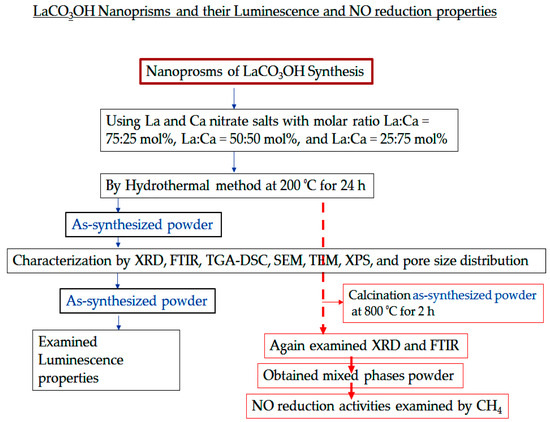 Among toxic gasses, the concentration of nitrogen oxides (NOx = NO + NO2) is growing due to the enormous increase in fossil fuel consuming vehicles, industries and urban development [23]. As a consequence, there have been serious environmental issues, such as increases in air pollutants, smog and global temperature increment. Among different air pollutant NOx is the most hazardous pollutant and prolong exposure can cause breathing difficulties, coughing, and cyanosis. Further, NOx becomes more toxic under the presence of solar radiation and produces toxic ozone by photochemical reaction. This causes toxic acid rain which creates problems in the atmosphere, humans, soil, rivers, and crops [24]. Therefore, to reduce NOx, several investigators tried zeolite catalysts as a selective catalytic reduction (SCR). However, due to the instability of zeolite catalysts in the presence of H2O vapor, this becomes an obsolete choice as exhaust gases mainly contain H2O vapor [25]. Further, the performance of three-way catalysts in the reduction of NOx also found insufficient under the condition of the oxygen-rich environment [25]. Therefore, chemicals such as n-octane hydrocarbons, propane, ethylene, and propylene, were recently getting attention in NO reduction under the presence of O2 [26,27]. Also, chemicals like methane having strong C-H bonding can be used as de-NOx catalysts. The only issue with methane as a reduction agent is that it works at higher temperatures. It was thought that this sort of catalytic mechanism is responsible for the methane oxidative coupling [28]. In addition, the exact NO reduction mechanism with CH4 in the presence of O2 over metal oxide leftover unsolved. The catalytic activities under the presence of O2 were performed by Fokema and Ying [29] for the oxides, i.e., Y2O3, Sc2O3, and La2O3 with CH4. Among the catalysts tested, La2O3 performed extremely well, and the presence of oxygen with CH4 is almost comparable in catalytic activity compared to that of Co-ZSM5. Moreover, it is found that different activities reported for La2O3, Sr/La2O3, and CaO are similar or greater. Recently, in the presence of oxygen with CH4, Fliatoura et al. recorded NO reduction of La2O3–CaO mixed oxides and pure CaO [30,31]. Anastasiadou et al. studied that Ca2+ system doped with La2O3 significantly increases the NO reduction with CH4 compared to pure La2O3 and CaO alone in the presence of O2 [32]. After doping CaO into La3+ ions, the same phenomenon was observed too. We reported Ca–Sm–Sn–Ni–O based oxides powders with mixed phases for NO reduction with CH4, C2H4, and C3H6 in the presence of O2 [33]. The performance of single-phase metal oxide ousted that of mixed-phase with other benefits of minimizing NO reduction time [34]. The co-precipitation method was used to prepare those mentioned above La2O3–CaO mixed oxides and CaO alone. But due to the large grain size, the surface area of the mixed oxide sample was very low. This co-precipitation synthesis process results in non-homogeneous particle distribution with the rough morphology of mixed oxide powders [35]. Hydrothermally synthesized powders, on the other hand, were having homogenous agglomerates, light in weight, low-temperature synthesis process, and high purity [36]. The above discussion highlights the fact that a simple template-free synthetic method would be highly attractive for increasing the purity and yield of specific morphologies. Template-free methods are simple because they involve a one-step effective solution-phase route to fabricating novel inorganic materials without assistance from other reagents. To the best of our knowledge, LaCO3OH samples with a nanoprism-like structure have not yet been fabricated via a facile hydrothermal method without the assistance of additives. We examined the PL properties of the as-prepared samples at room temperature. Additionally, CaO containing La2O3 and LaCO3OH powders were synthesized hydrothermally and heat-treated at 800 °C. Further, under the presence of H2O vapor and oxygen, the reduction pattern of NO was analyzed by using hydrocarbons.