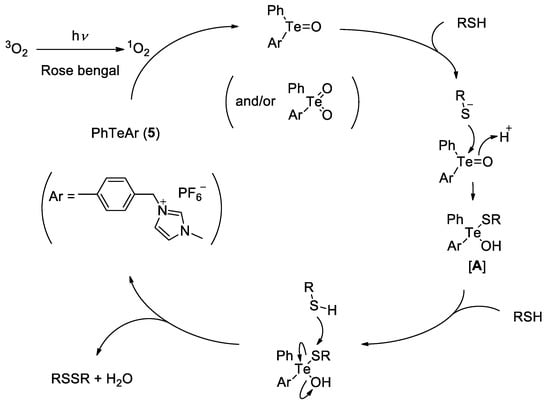 Although the active species for this oxidation reaction could not be identified at the present stage, a possible catalytic cycle was proposed according to our previous paper (Figure 1) []. Namely, singlet oxygen oxidation of the telluride catalyst 5 gave the corresponding telluroxide (and/or tellurone), which underwent a nucleophilic attack by thiol to afford an adduct A. Then, the adduct A reacted with another thiol to give the disulfide along with regeneration of the catalyst 5.