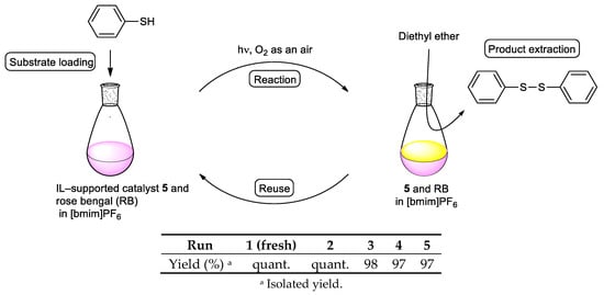 Finally, we investigated the reusability of the IL-supported diphenyl telluride 5 employing the conditions shown in Entry 7 of Table 2. After completing the thiophenol oxidation, the resulting diphenyl disulfide was isolated via extraction with diethyl ether, and the remaining [bmim]PF6 solution containing IL-supported catalyst 5 and rose bengal could be reused at least four times in the subsequent reactions with only a slight decrease in the product yield (97% after four times recycling, Figure 2).