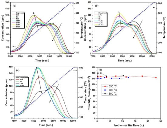 Figure 2 shows the NH3-TPD profiles for Cu-CHA with increasing aging times at 650, 700 and 800 °C. The intensity of the peaks in the higher temperature region of the curves decreased and the intensity of the peaks in the lower temperature region increased with increasing time, in line with the observations in the literature [57]. Meanwhile, the total NH3 storage stayed nearly constant with increasing aging time at all the temperatures investigated in this study (Figure 2d).
