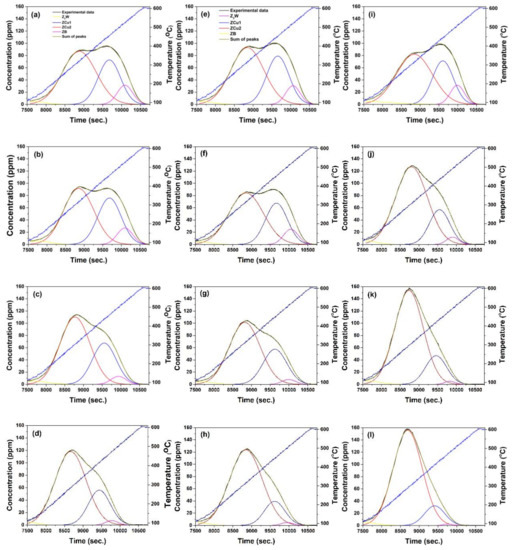 Deconvolution of TPD profiles after successive HA steps (a–d) 650 °C, (e–h) 700 °C, (i–l) 800 °C.