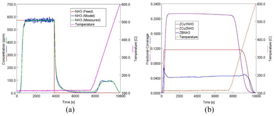 The parameters of rate expressions of Reactions 4–11 were also optimized in GT-POWER using the experimental NH3 adsorption/TPD data of the degreened catalyst via a genetic algorithm. Parameters of the rate expressions of Reactions 12 and 13 were obtained using the experimental data of NH3 oxidation for the degreened catalyst while keeping the parameters of Reactions 4–11 constant. Then, the HA kinetics model and the model for the adsorption and desorption of NH3 was linked through the utilization of Equations (1)–(14), and along with Reactions 1–11, to describe the NH3 adsorption and desorption after a certain HA treatment. The HA kinetics model was linked to the models of NH3 adsorption, desorption and oxidation through the utilization of Equations (1)–(14) and Reactions 1–13.