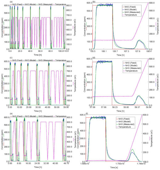 Temperature profiles, experimental and predicted NH3 concentrations throughout the successive HA sets carried out at (a) 650 °C, (c) 700 °C, (e) 800 °C. Experimental and predicted NH3 concentrations during the last NH3 adsorption/TPD experiments for the HA sets carried out at (b) 650 °C, (d) 700 °C, (f) 800 °C.