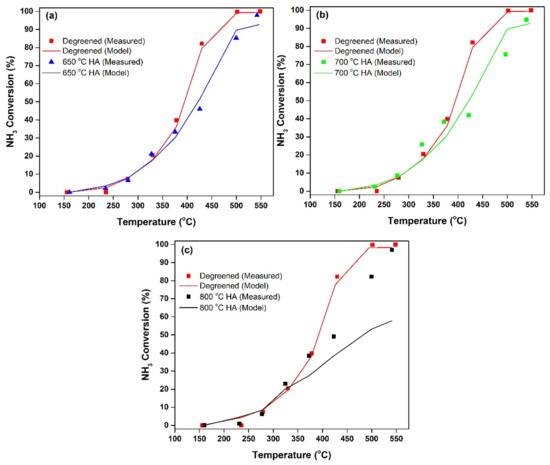 Figure 7 shows a comparison of the measured and predicted NH3 conversion with temperature for the degreened and aged samples for the oxidation of NH3. Three NH3 oxidation experiments were performed subsequent to the completion of the three HA sets carried out at 650, 700 and 800 °C, shown in Figure 6a,c,e (the conditions of aging also shown in Figure 4b,d,f). Figure 7a shows the measured and simulated data for NH3 oxidation experiment after 46 h of isothermal HA at 650 °C. Here, the experimental data show decreased NH3 oxidation activity at temperatures above 330 °C, as compared to the degreened Cu-CHA. The model is in excellent agreement with the measured values. Thus, the phenomena associated with HA causing a decrease in NH3 oxidation activity could be modeled via just accounting for the changes in the fractional coverage of NH3 storage sites of the Cu-CHA, while keeping the turnover rate constants and the activation energies of the Reactions 12–13 obtained from the NH3 oxidation experiment of degreened Cu-CHA unchanged. The predicted changes in the fractional coverage of storage sites upon HA are affecting the values required for Equations (3) and (12), thereby enabling the prediction of NH3 oxidation performance after HA. Similarly, good agreement between experimental data and model predictions was obtained for NH3 oxidation experiments after 25 h of isothermal HA at 700 °C (Figure 7b). After 21 h of isothermal HA at 800 °C (Figure 7c), the model could capture the decrease in conversion of NH3 upon HA as compared to the degreened sample. However, the model underestimated the conversion of NH3 at temperatures higher than 350 °C.
