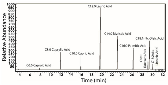 The residual babassu oil chromatogram reveals a well-defined peak of lauric acid (C12:0), whose retention time (rt) is 19.68 min. The GC analysis identified others expressive peaks in the chemical composition of the residual babassu oil: caproic acid (C6:0), caprylic acid (C8:0), capric acid (C10:0), myristic acid (C14:0), palmitic acid (C16:0), stearic acid (C18:0), oleic acid (C18:1n9c), linoleic acid (C18:2n6c). Melo et al. (2019) [55], analyzed the fatty acid composition of babassu oil, the results confirming the high levels of lauric acid in babassu oil (47.40%). The difference in melting point did not influence the content of lauric acid. The results confirmed the high content of saturated fatty acids of babassu oil; this is mainly due to the high content of lauric acid. As can be seen in Table 2, lauric acid had a content of 41.55% in the composition of residual babassu oil.