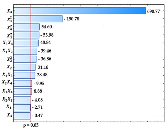 Pareto chart indicating the effect of the estimated values for the studied variables in the enzymatic esterification of the babassu free fatty acids. (X1) temperature (°C), (X2) time (hours), (X3) molar ratio (FFAs: alcohol), (X4) biocatalyst content (% m/m).