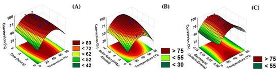 Response surfaces for (A) temperature versus time; (B) temperature versus molar ratio (fatty acid: alcohol); (C) Temperature versus biocatalyst content; reaction medium: babassu free fatty acids 1:1–1:1:15 (free fatty acids/alcohol), biocatalyst mass of 5–15 g. Reactions were carried out for 2–6 h at 30–50 °C at 200 rpm. Further specifications are described in Section 3.
