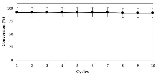 Figure 4 shows the conversion in ethyl esters produced after different cycles of reuse using Novozym® 435, under optimal conditions of reactions. It is possible to verify that at the end of 10 consecutive cycles, the enzyme maintained 91% of catalytic activity.