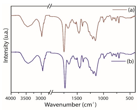 The Novozym® 435 is produced from immobilization of the lipase B from Candida antarctica, adsorbed on a macroporous resin composed by poly (methyl methacrylate acid) (PMMA), crosslinked with divinylbenzene (DVB). It is reported that after the esterification reaction may occur the enzyme desorption [93]. Thus, FTIR spectra were obtained for the biocatalyst before (Figure 5a) and after (Figure 5b) the esterification reaction of free fatty acids, in order to obtain information about its structure. For the Novozym® 435 samples, broadbands in the range of 3600–3100 cm−1 correspond to O–H and N–H stretching. The vibrational modes of asymmetric and symmetric stretching methyl groups were observed at 2950 and 2875 cm−1, respectively. The band centered in 1732 cm−1 can be related to the stretching vibration of carbonyl groups ν(C=O) of the PMMA [94]. The bands at 1452 and 1512 cm−1 confirm the presence of DVB in the structure of the biocatalyst since it can be associated with the bond stretching between carbon atoms in the aromatic ring [95]. Moreover, the bands observed from 869 to 682 cm−1 are characteristic of the C–H out-of-plane bending of alkyl-substituted benzene. The presence of the lipase B from Candida antarctica can be confirmed by bands at 1654 and 1539 cm−1 that correspond to the Amide I and Amide II [96]. These same bands also were observed in the spectrum obtained after the esterification reaction. However, it is important to analyze not only the profile and the association of the bands. The ratio between the bands at 1732 cm−1 and 1654 cm−1 can be used to verify if there is any charge in the biocatalyst related to the enzyme or support. For the Novozym® 435 (Figure 5a), this ratio (3.663) is greater than catalyst after reaction (Figure 5b) (2.678), suggesting a small change in the support/enzyme ratio after the reaction.