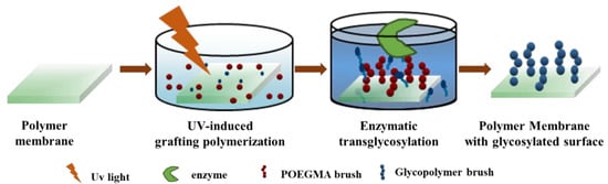 Previous studies have reported that the carbohydrates can be conjugated onto the surfaces via several methods [15,16,17,18,19,20,21,22,23,24]. Examples include non-covalent immobilization through hydrogen bonding, hydrophobic interaction, van der Waals force, electrostatic interaction, covalent immobilization through different chemical reactions including Michael addition, click and surface-initiated atom transfer radical polymerization. These methods, however, are typically not effective enough to be compatible for the polymer membranes that need to be surface glycosylated. For example, the main problem of the non-covalent immobilization is that the glycosylated surfaces are unstable and will be more easily abraded from the substrates in the commonly used environments, while the surface carbohydrates via covalent immobilization usually have disordered conformation structures since the chemical reactions are non-site- and stereo-selective. This will eventually lead to the restriction of the highly specific recognition property of the immobilized carbohydrates. In addition, the non-site selectivity usually results in tedious reaction steps including protection, deprotection and coupling.