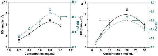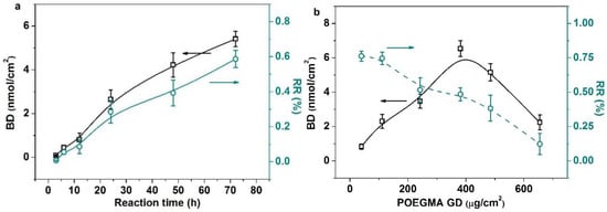There are four typical influencing factors which affect enzyme-catalyzed transglycosylation. (a) Influence of reaction time on the BD and the RE (enzyme concentration (0.8 mg/mL), lactose concentration (10 mg/mL), POEGMA GD (350 μg/cm2)); (b) influence of POEGMA GD on the BD and the RE (enzyme concentration (0.8 mg/mL), lactose concentration (10 mg/mL), reaction time (72 h)); (c) influence of enzyme concentration on the BD and the RE (POEGMA GD (350 μg/cm2), lactose concentration (10 mg/mL), reaction time (72 h)); (d) influence of lactose concentration on the BD and the RE(POEGMA GD (350 μg/cm2), enzyme concentration (0.8 mg/mL), reaction time (72 h)). All experiments were repeated six times.