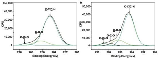 High-resolution XPS spectra of C 1s: a, the POEGMA-modified MPPM (POEGMA GD = 350 μg/cm2) and b, the galactose-modified MPPM (POEGMA GD = 350 μg/cm2, glyocosyl BD = 1.603 nmol/cm2. (Peak area (%): a, C–C/C–H: 88.69%, C–O–X: 7.27%, O–C=O: 4.05%); b, C–C/C–H: 83.96%, C–O–X: 6.00%, O–C–O: 3.61%; O–C=O: 6.34%).