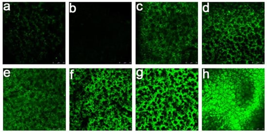 Confocal laser scanning microscopy (CLSM) pictures of the membranes’ surfaces after interaction with RCA120-FITC: (a) MPPM, (b) the POEGMA-modified MPPM (POEGMA GD = 350 μg/cm2), and (c ~ h) the galactose-modified MPPM (POEGMA GD = 350 μg/cm2, glycosyl BD = 0.08 nmol/cm2, 0.44 nmol/cm2, 0.80 nmol/cm2, 1.60 nmol/cm2, 3.63 nmol/cm2, 5.41 nmol/cm2). All experiments were repeated three times.