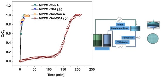 The filtration performance of the glycosylated membrane was investigated using FITC-RCA120 and FITC-Con A as model proteins (Figure 5). We found that the breakthrough curve of FITC-RCA120 is similar to that of FITC-Con A for the pure membrane. There was a negligible non-specific protein binding on the nascent membrane surfaces. For the glycosylated membrane with a glycosyl density of 5.410 nmol/cm2, the breakthrough curve is definitely different for both lectins. As expected, large amounts of FITC-RCA120 are affinity adsorbed on the glycosylated membrane surface. Therefore, the corresponding concentration of effluent is low at the first fraction. When the effluent time exceeds 120 min, the effluent concentration rapidly increases and then levels off due to saturation of the affinity adsorption. In addition, the glycosylated membrane did not adsorb FITC-Con A on the surface, which is due to the non-affinity interaction between the galactose and Con A.