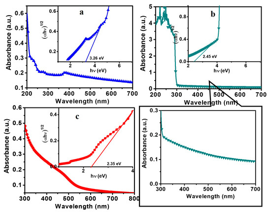 UV–Vis absorption spectra of the (a) ZnO NFs, (b) composite NFs, and (c) CdS nanoparticles (NPs); the insets show the Tauc plots.