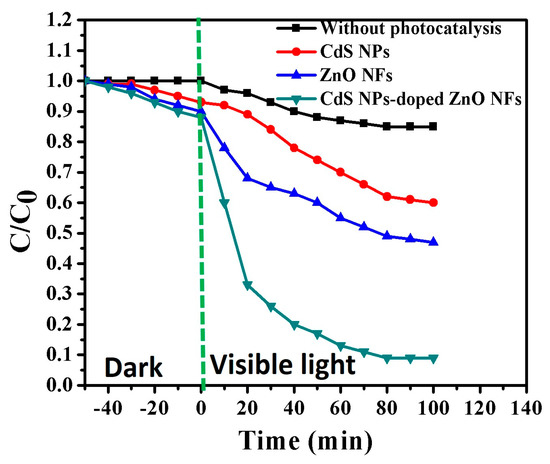 The photocatalytic performance of the composite NFs on the degradation of MB under visible light irradiation was compared to those of the pristine ZnO NFs and CdS NPs, and the results are reported in Figure 6. As shown in the figure, the photodegradation ratios of MB under visible light irradiation after 100 min were 90%, 47.3%, and 35.5% for composite NFs, ZnO NFs, and CdS NPs, respectively. Furthermore, the photodegradation ratio of MB in the absence of photocatalyst was lower than 15%. The reaction kinetics of MB photodegradation were evaluated using the following pseudo-first-order linear regression relation: