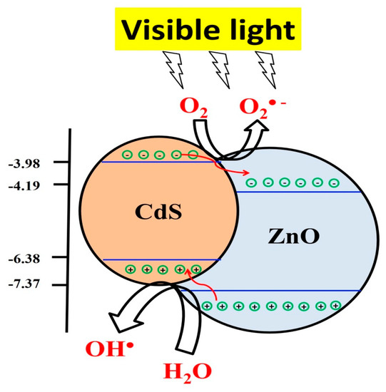 Figure 7 illustrates the charge transfer and separation mechanism that supports the high photocatalytic activity of the coexistence of CdS and ZnO under visible light irradiation. The photocatalytic decolorization of MB in aqueous solution is initiated by the photoexcitation of the composite NFs under visible light leading to an easier transfer of the excited electrons from the conduction band (CB) of CdS to that of ZnO. This is due to the CB of ZnO (ECB = −4.61 eV) being lower than that of CdS (ECB = −3.98eV). However, the valence band (VB) of ZnO (EVB = −7.37 eV) is more negative than that of CdS (EVB = −6.38 eV), which may also lead to hole transfer from the VB of ZnO to that of CdS [2,5,38]. The photogenerated holes in CdS produce hydroxyl radicals (OH•) due to the reactions of the holes in CdS with water molecules. The migrated electrons on the CB of ZnO produced superoxide radicals (O2−•). The superoxide radicals react with holes and water and produce large numbers of hydroxyl radicals in the solution, which are considered strong oxidizing agents to decompose the organic pollutants in wastewater [39]. The photodegradation of MB under visible light mainly depends on the hydroxyl and superoxide radicals [40]. The photocatalytic degradation mechanism of the MB dye in our experiment is shown below.