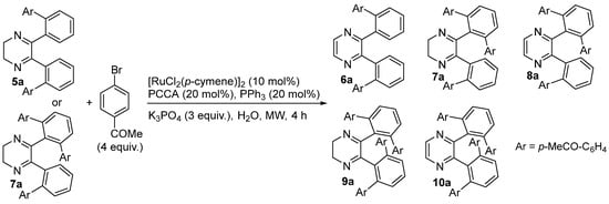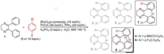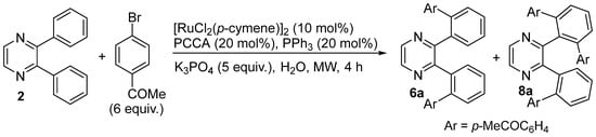 We initiated our study by the reaction of 5,6-diphenyl-2,3-dihydropyrazine (1) with 4-bromoacetophenone as sterically non-demanding arylating agent, using the methodology for microwave-promoted Ru(II)-catalyzed arylation of 2-phenylpyrimidines in water developed within our group []. Due to the presence of the four ortho-C–H bonds in diphenylpyrazine 1, up to four arylations were expected. Even though we intended to directly apply the previously established catalytic conditions [] for the present arylation of dihydropyrazine substrate 1, the effect of base, solvent, ligands, and temperature was briefly investigated under conventional heating (see Supplementary Materials Supporting Information). The system comprising [RuCl2(p-cymene)]2/1-phenylcyclopentane-1-carboxylic acid (PCCA)/PPh3 together with a large excess of K3PO4 base has once again proven to be a catalyst system of choice, since quantitative conversions of 1 with four.equivalents of 4-bromoacetophenone into arylated pyrazine products in satisfactory diarylation selectivities were attained in water at 140 °C after 24 h. In order to shorten reaction times and to suppress aromatization of starting dihydropyrazine 1 and its arylated products, the reactions were performed in water under microwave (MW) heating conditions.
