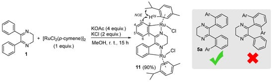 We were also able to isolate metallacycle 11 from the reaction of 1 with 1 equiv. of [Ru(p-cymene)Cl2]2 resulting from double cycloruthenation in MeOH at room temperature in 15 h, by using methodology established by Dixneuf for the synthesis of five-membered ruthenacycles from substrates with various N-containing functionalities [,]. The successful generation of bis-ruthenacycle 11 (90% yield) might suggest that ortho-C–H activations on the two phenyl groups could occur simultaneously. This is somehow reflected by the smooth formation of diarylated product 5a, while the product with two arylated ortho-positions on the same benzene ring was not detected (Scheme 3). Although we were not able to prepare suitable monocrystals of 11 for X-ray analysis, its solution structure was revealed by HRMS, and by one- and two-dimensional NMR techniques (see Supplementary Materials Supporting Information). The HRMS mass spectrum of the compound 11 shows the molecular peak [M + H]+, m/z = 775.0744 (calculated: 775.0734) and in 1H NMR spectrum (CDCl3) the complex 11 shows only one set of proton resonances suggesting a highly symmetric structure. The cyclometallated phenyl H6 and H3 protons are displayed as two non-equivalent doublets at δ = 7.58 ppm and δ = 8.24 ppm, respectively. The isopropyl group of the p-cymene is observed as two non-equivalent doublets at δ = 0.89 and 1.07 ppm, and its four aromatic protons exhibit four different resonances between 4.98 and 5.66 ppm as expected for a p-cymene ligand in a chiral-at-metal Ru(II) complex center. Methylene protons of the dihydropyrazine ring are observed as two multiplets at 4.23 and 4.63 ppm indicative of hampered conformational flexibility generating quasi equatorial and axial proton positions. The 1H–1H NOESY spectrum shows spatial proximity of H3 proton of the cyclometallated group and aromatic p-cymene proton, which has a through-space interaction also with one methyl group of the isopropyl group. In the 13C NMR spectrum, the expected number of carbons corresponding to the symmetrical structure can be seen, and the metallated carbon C2 is observed at 194.0 ppm. The C=N carbon is observed at 167.9 ppm, while the methylene carbons resonate at 58.7 ppm. Cyclometallation of 1 with palladium has been previously carried out by reaction with lithium tetrachloropalladate to prepare similar bis-cyclopalladated products [].