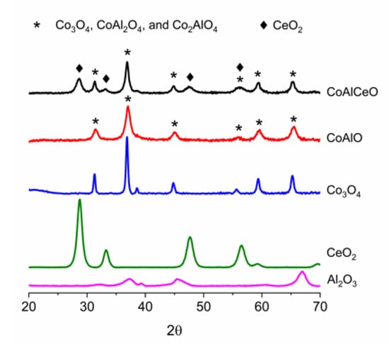Figure 3 shows XRD results of the calcined mixed and single oxides. For CoAl and CoAlCe, a crystalline phase (∗) corresponding to three spinel phases was evidenced: Co3O4 (ICDD-JCPDS 42-1467), CoAl2O4 (ICDD-JCPDS 44-0160) or Co2AlO4 (ICDD-JCPDS 38-0814). These phases cannot be distinguished from each other, since their diffraction peaks are close both in intensity and in position [,]. In addition of the spinel structures, cerianite CeO2 phase (♦) (ICDD-JCPDS 34-0394) is also observed in the CoAlCe diffractogram. The diffraction peak at 47.6° can be also attributed to hexagonal Co–Ce–O phase (ICDD-JCPDS 04-3282). According to Huang et al. 2015 [], this Co–Ce interaction becomes stronger when calcination temperature is higher than 400 °C. A single oxide, CeO2, shows clear diffraction patterns of the cubic cerianite phase. Co3O4 single oxide is identified as the cubic phase (ICDD-JCPDS 42-1467) and Al2O3 shows the characteristics of the cubic gamma phase based on the ICDD-JCPDS 01-1303 file. Calculated crystallite sizes of Co species for CoAl and CoAlCe catalysts were 9 nm and 13 nm, respectively.